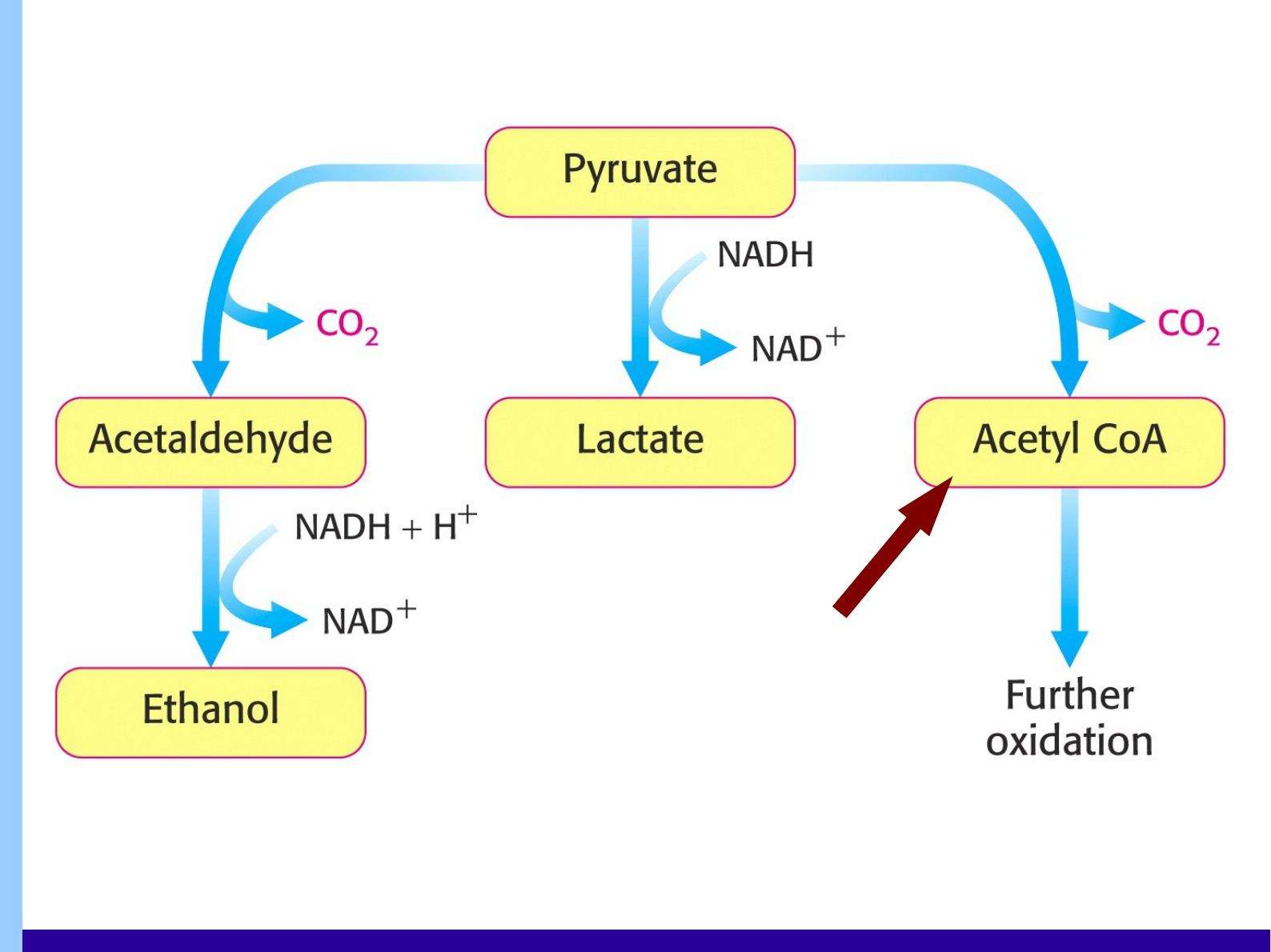 Opiruvatorecebe elétrons H+ provenientes do NADHetransforma-se em ácido láctico, que posteriormenteéeliminado pela célula. Ele pode também se transformar em álcooleCO2, que tambémsãoposteriormente eliminados.
