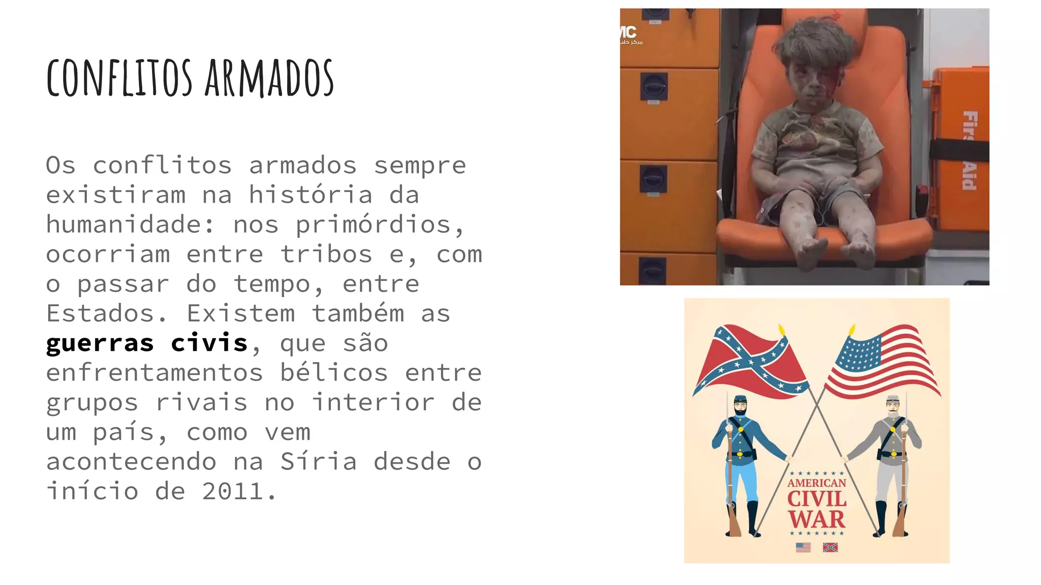 Osconflitosarmados, da forma comoodireito internacionalosdefine, sãoconflitosentre partes de uma mesma naçãonoqual se faz uso de armamento bélico. Pode haverconflitosentre duas ou mais nações, em queocorraouso da força e dearmas.