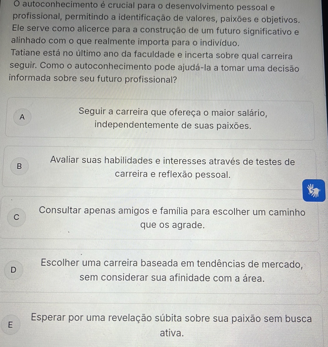 Terautoconhecimentoéum processo fundamentalparaque, durante a sua jornada pela vida, você consiga encontrar objetivosetraçar caminhos que façam sentidoparavocêede alguma maneira lhe tragam satisfaçãopessoaleprofissional.